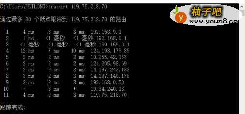 3在命令模式窗口下,我们在里面输入tracert 119.75.218.70,然后按下回车键确认即可追踪到本地电脑到BD网所在地的路由器线路。如下图所示: