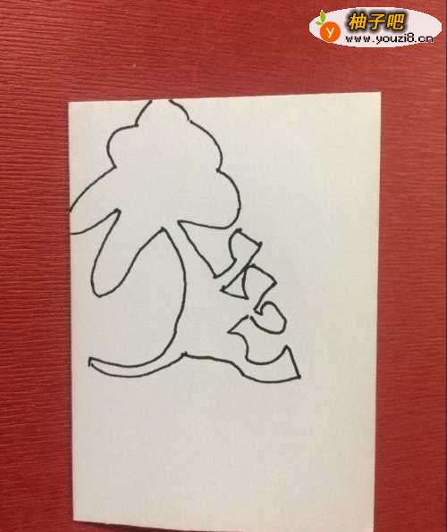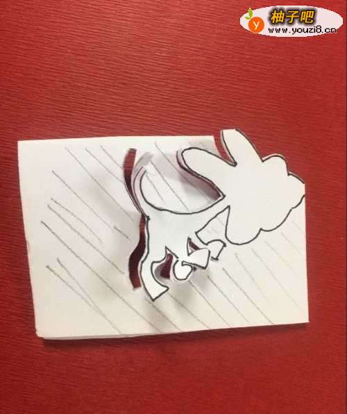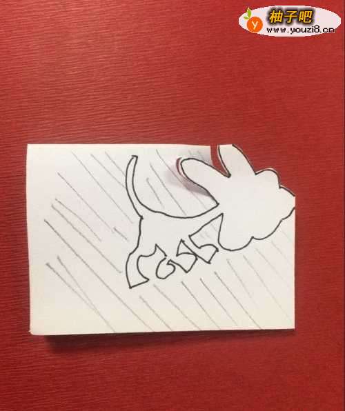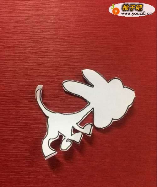 5然后沿着画线开始剪,从哪里开始剪可以随意,没有规定的。我们先从头部开始剪,狗狗的嘴部和一只耳朵的边缘是和下面的纸连着的不要剪断了。就是说没有画线的地方不要剪了。
