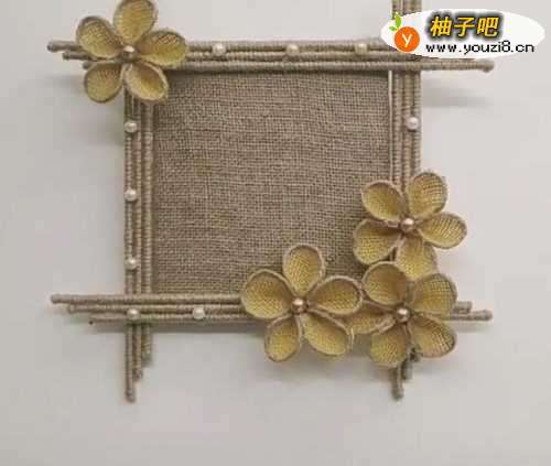 6最后我们可以用一些麻布制作成的花朵给他粘贴在左上角和右下角这个一个相框就完成了。