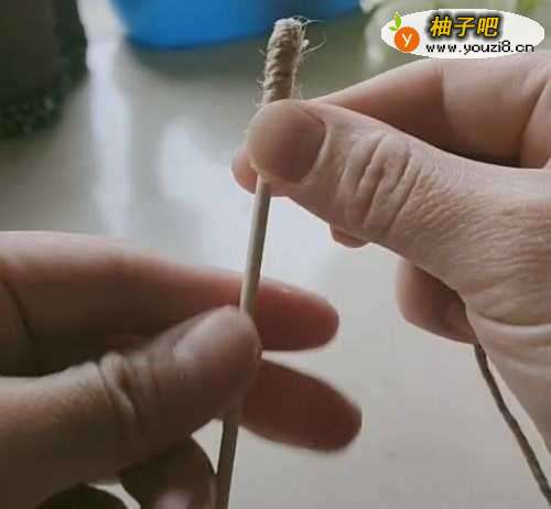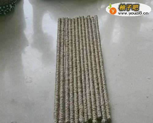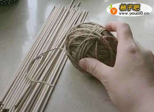 2我们将一次性筷子贴上双面胶,用这些细的麻绳给他裹上