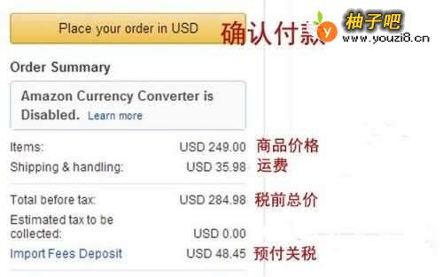10确认订单:点击“Place your order in USD"您的订单生效。说明:美国亚马逊直邮中国会预收中国关税,清关后会根据实际情况,多退少不补。税单可向物流公司咨询索要。