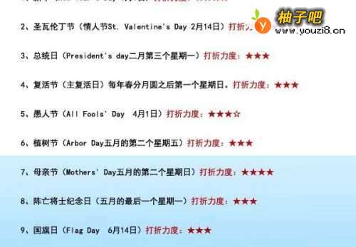 打折季海淘攻略是很多海淘者极为关心的问题。美国在某些节日的时候,各大商场的都会搞活动打折促销,而且很多的打折力度都非常大。很多很好的商品都可以用很少的价钱来买到,绝对能够激起你强烈的购物欲望。可见折扣是有多么的吸引人, 下面我来整理一下重大折扣的具体时间: