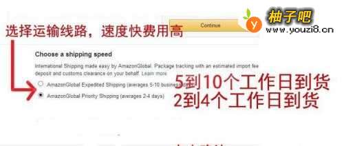 8选择直邮线路:美国亚马逊提供Expedited Shipping / Priority Shipping 即普通/优先两种直邮方式,价格不同,运送时间也不同。至于美国亚马逊采用什么快递,是亚马逊系统分派的,通常为DHL、UPS。根据个人需求选择所用送货方式,点击按钮Continue,进行下一步。
