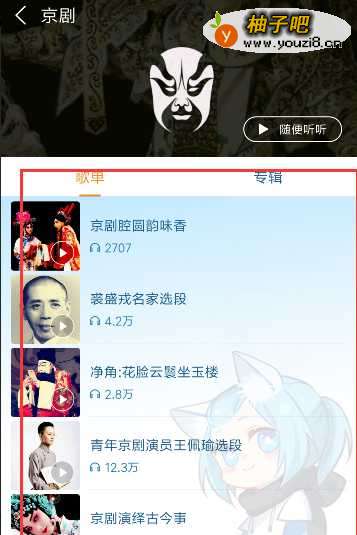 7假如,你现在京剧,然后,就会来到京剧的页面,你会看到各种京剧,还有专辑,如图所示