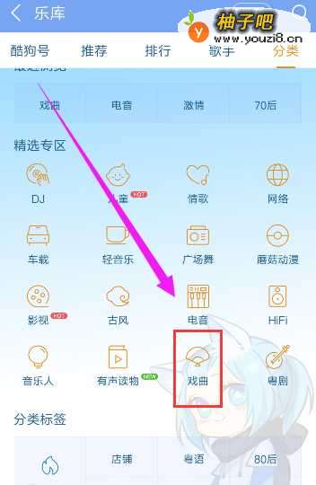 5进入酷狗分类的选项,在这个页面中,你会有个戏曲的选项,如图所示