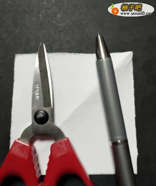 第一步,先把要用到的工具准备好,剪刀、笔和一张正方形纸。