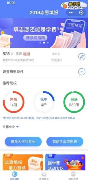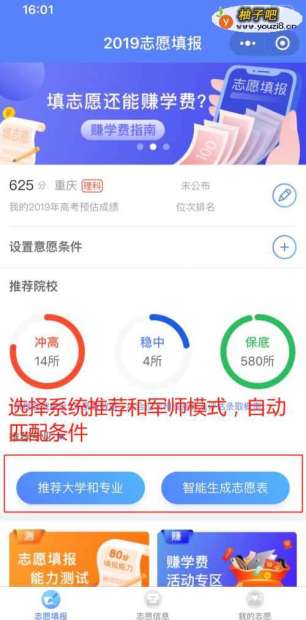 3选择系统推荐或军师模式,一键生成匹配高校和大学信息,预测填报结果。