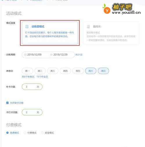 4选择【训练营模式】,分别设置【训练周期、休息日、补卡次数、缺卡次数】、选定【付费模式】中的一种,点击【下一步】