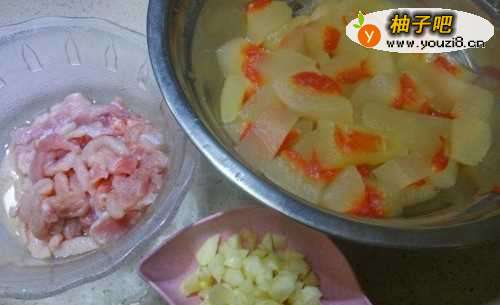 西瓜皮切掉外面的绿皮,切成小块用水煮软(煮二十分钟),捞起晾凉后用手挤掉多余的水分。煮好的西瓜皮一次用不完可以用食品袋装起来放进冰箱速冻箱中,下次要做取出来融化即可。瘦肉切成丝或片,蒜切碎待用。