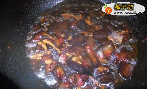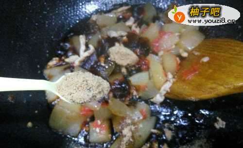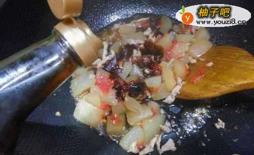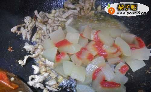 8加点水熬煮一会儿(2-3分钟),让西瓜皮入味。