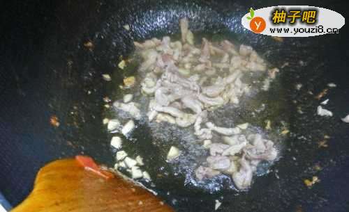 3先倒入肉片翻炒,炒至肉片颜色变白。