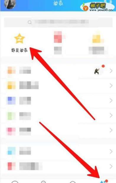 QQ登录了个人账号之后,点击右下角的【动态】,再点击左上方箭头所指的【好友动态】。