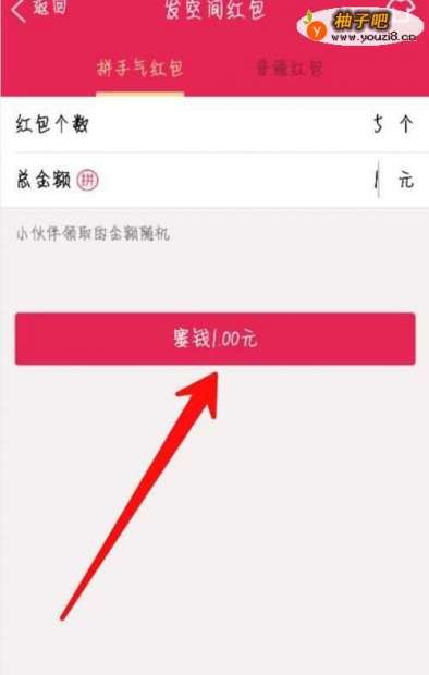 6在这个发空间的界面,我们可以选择发拼手气还是普通,根据自己的需要选择就可以了,选择了之后输入发的个数、总金额,然后点击箭头所指的塞钱。