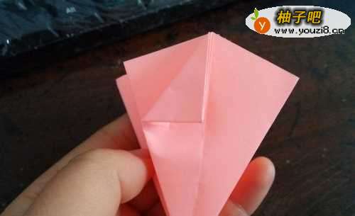 4然后我们把两层纸的地方向内折,全部折好后就是图二。再把下侧的角向上折,