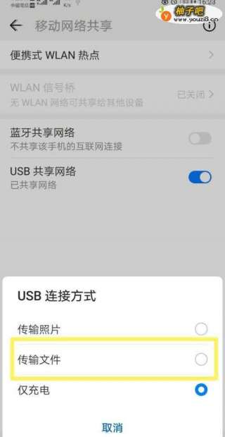 通过数据线连接手机和电脑。此时手机会弹出USB连接方式,选择“传输文件”。
