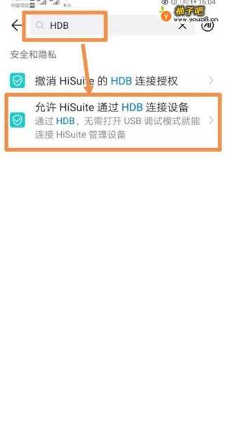 2打开手机设置功能,在搜索栏输入“HDB”,选择“允许HiSuite通过HDB连接设备”。