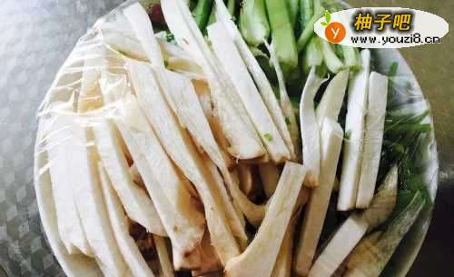 首先吧芹菜去根去叶洗干净切断备用,杏鲍菇一样洗净切丝备用,杏鲍菇的丝不用太细。里脊肉切丝。