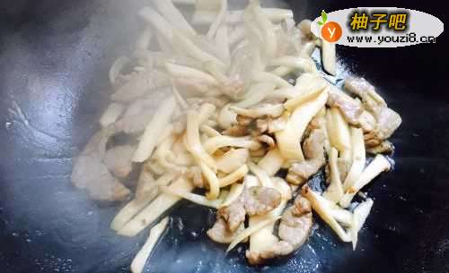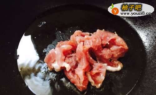 2锅烧热放油,油热了之后加入肉丝翻炒至变色。
