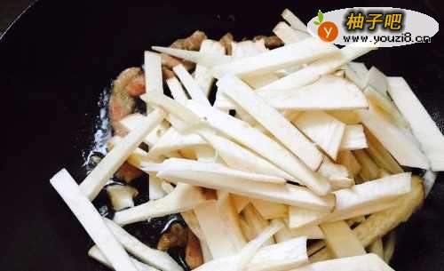 3接着加入杏鲍菇,翻炒一会。