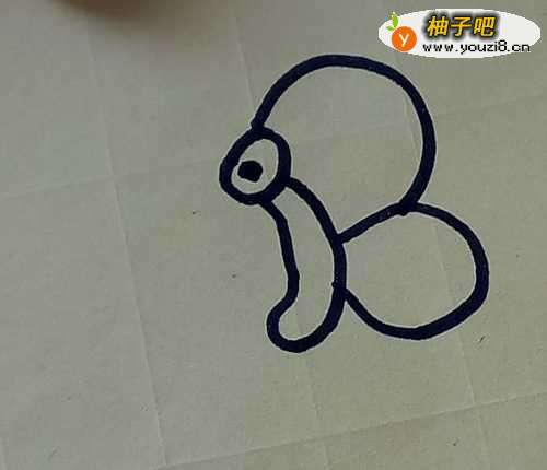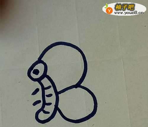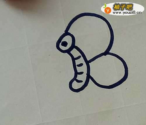 我们先在纸上画一个小小的圆形做蝴蝶的头,然后画上一个相连的长长的椭圆形,稍微向左侧弯一点,并在背上画上一大一小两个翅膀