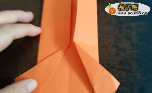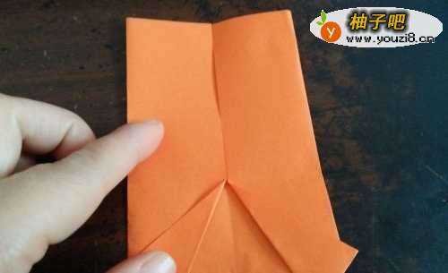 6翻到另一面,我们从中间对折,如图一。把上边的两个角向内折,并折到后边。把内侧的两边向外翻折,如图三,我们把翻过来的折纸插到底下去,如图四。