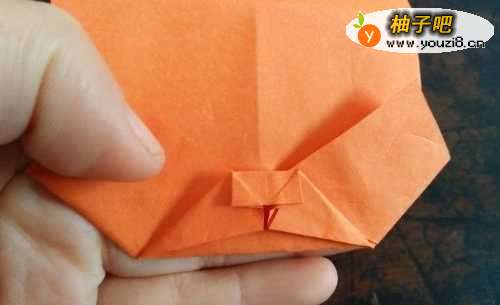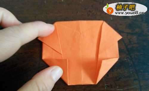 7把下角向外折,上边的两个角向外拉,然后再重复折一次,如图二的样子。小狗狗的脑袋就折好了。