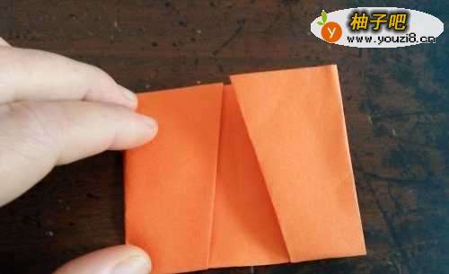 4把中间的角打开呈长方形,然后把两侧的角塞到两侧的折纸里。我们把上边的两个角向下折,如图三。接着再把边折到彩纸的后边,如图四。