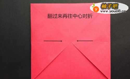 2将纸翻转过来,另外两角往中心对折,压平后,将纸往靠近一半的1/3处折叠,使下半部分三等分。上边同样操作。