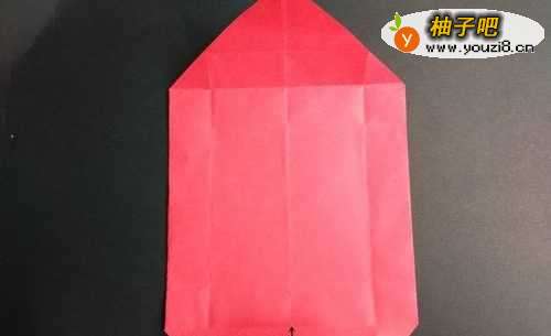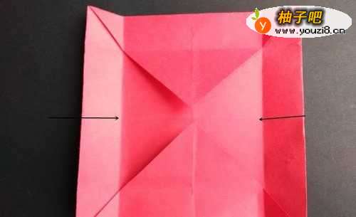 9另外两边从中间分别往左往右,如图折叠。再将上面部分翻上去,上面左边和右边直角部分芬分别往中间折,下面直角部分左边右边往中间折。