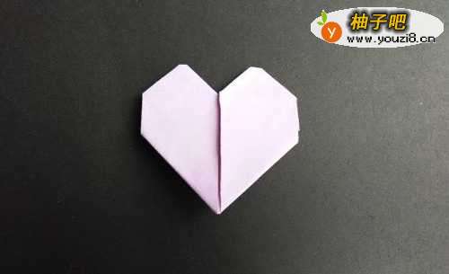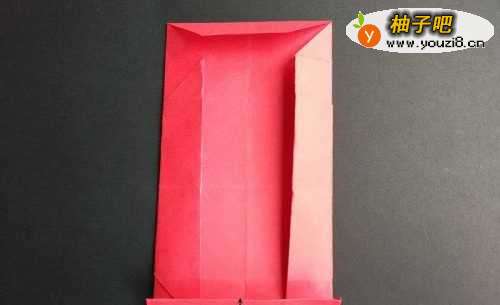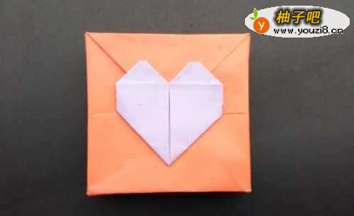 10将纸翻到正面,后面一层往下折入,折好如图,再将心的部分放在作为盒盖的那部分上面即可,可以竖放或者横放,将它们组合起来。成功。