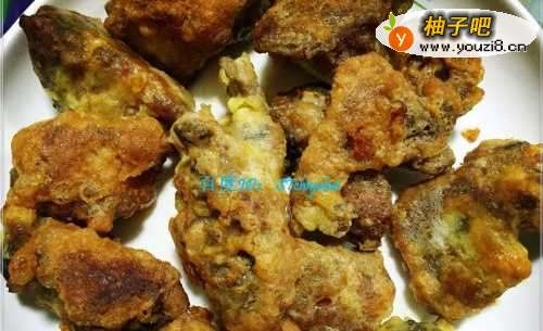 5将粘料的排骨放入油锅中炸一会,然后捞出,重新放入鸡蛋液中粘料,如此反复。