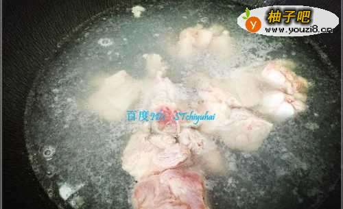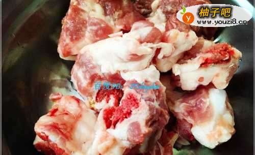 2水开了之后放入精排骨焯一阵,一会焯出骨头中的血水,将其捞出放入冷水中清洗,沥干加入各种调味料腌制。