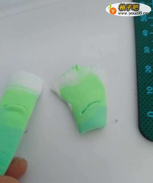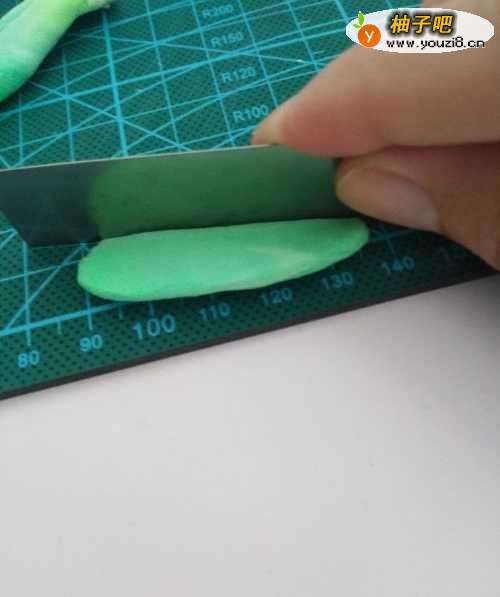 2下面依次做芹菜的四个部分,第一个部分是较矮的一片,从揉好的粘土中剪出这一部分