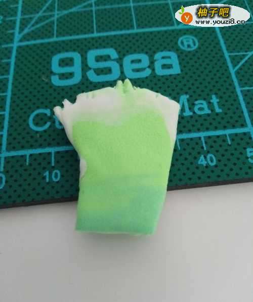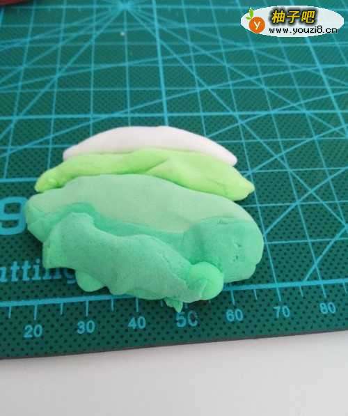 取从深到浅的不同颜色的绿色粘土,以及白色粘土,按图中的顺序排列,然后反复的折叠、按压,多次后做出如图所示的渐变色的泥土硬片