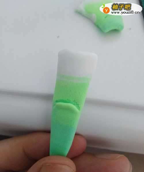 3另一部分是长的,顶部白色的要多一些,借助工具做出嘴巴的形状,嘴唇向外翻一点