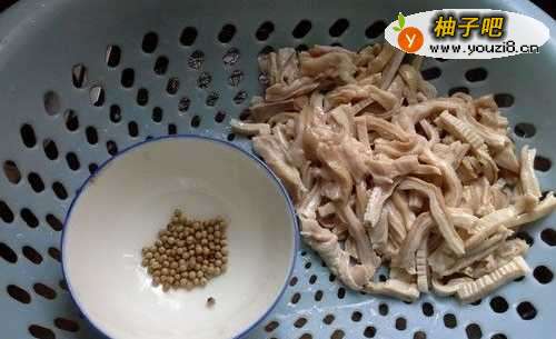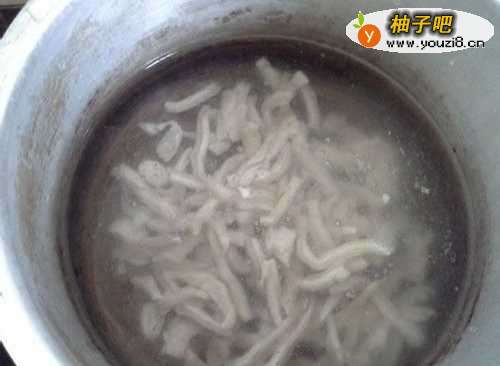 2把猪肚清洗干净,焯水,然后切丝,沥干水分。