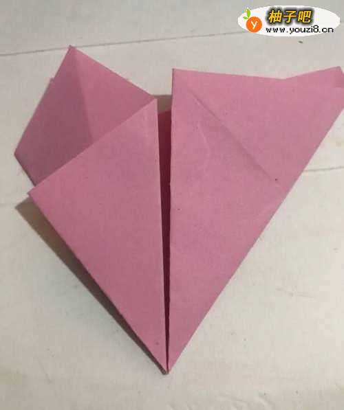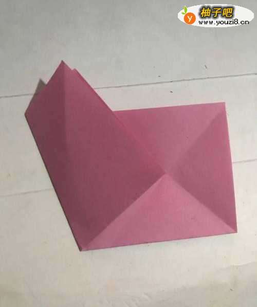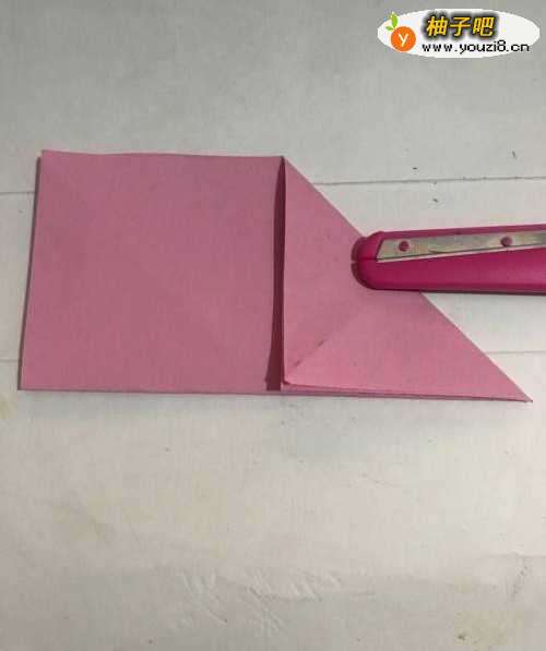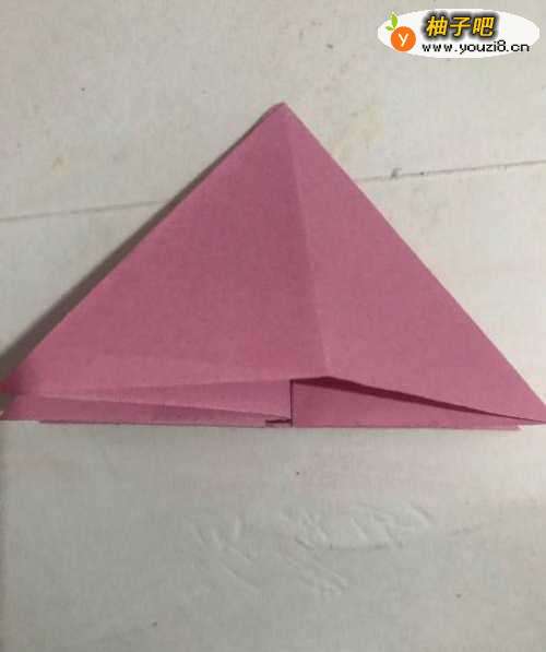第一步 取一张16厘米长X16厘米宽的正方形粉色彩纸 把它从下向上对边折叠 折好后拿起右上角向下对齐折叠