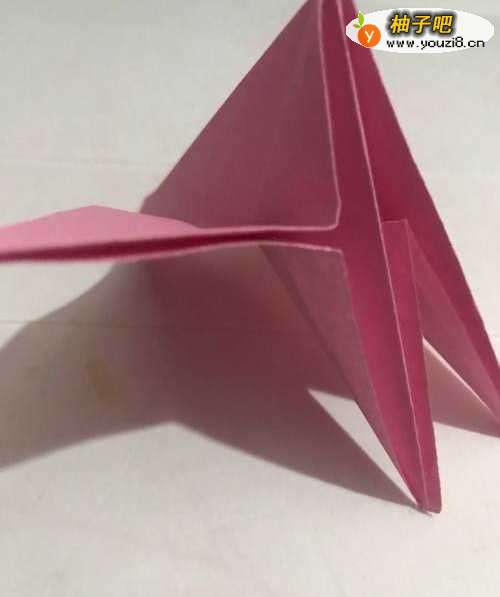 7第七步 几个角都折完之后 再把它拿起来 把两个双边捏在一起 把第三个边向上折倒 其它两个与它折齐