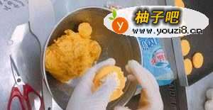 2等南瓜泥凉凉,分多次加入糯米粉,揉搓至面盆光滑