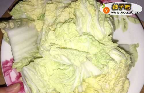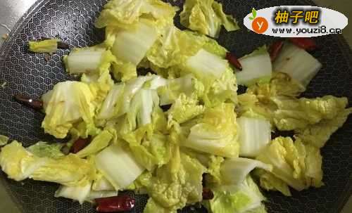 4接下来就是放入白菜,反复煸炒,中途不要加水,要将白菜煸炒至“软乎”就可以下一步了。