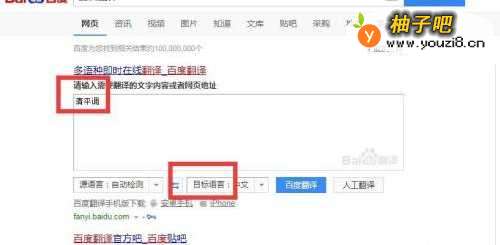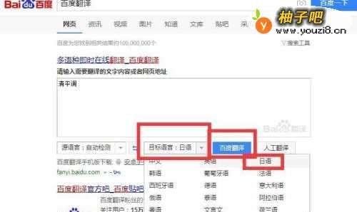 5然后点击“目标语言”,选择“日语”,接着点击“百度翻译”,如图