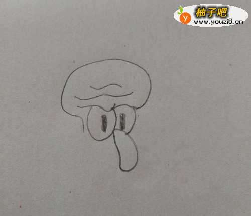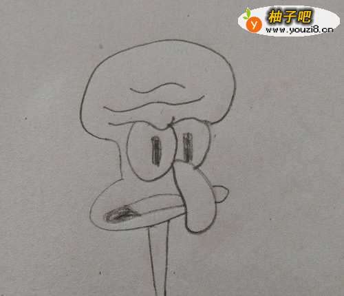 2我们再往下给章鱼哥画上大大的眼睛,还有里面长长的椭圆形的眼珠,并画上它的长长的鼻子