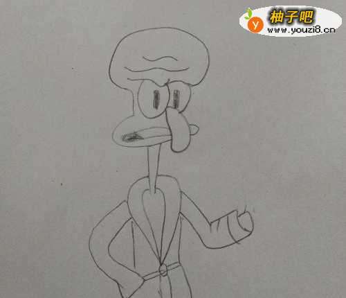 4然后我们往下画上章鱼哥的身体,并把它左边的手插在腰间,右边的手抬起来的姿势