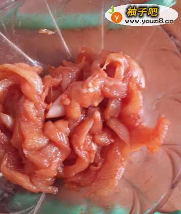 将鸡肉切条,加入调料(食盐、辣椒粉、白糖、鸡精、酱油)腌制入味