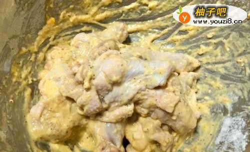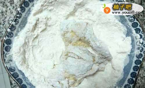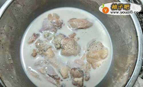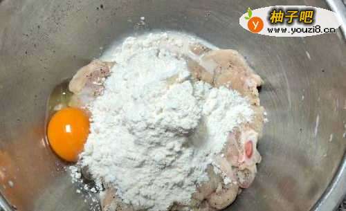 4鸡翅腌好后把牛奶倒掉,放入3勺面粉、鸡蛋