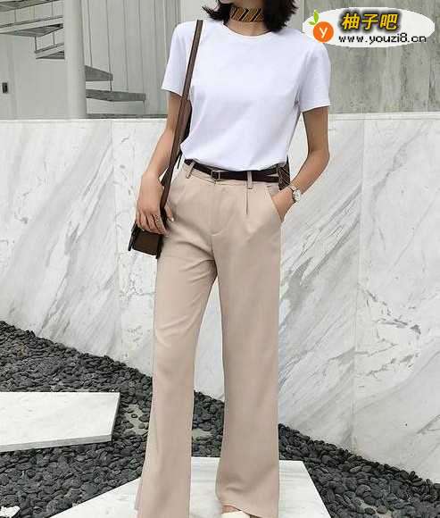 搭配一:米白色拖地裤+黑色运动背心+蓝色条纹衬衫对于小个子女生来说,选择垂顺感比较强的拖地裤比较合适,这样从实现上会比较显腿长,这款米白色拖地裤就是很垂的面料,上衣穿一件黑色运动背心,能够很好的提升腰线,外搭一件蓝色条纹衬衫,又增加了几分休闲感和帅气。