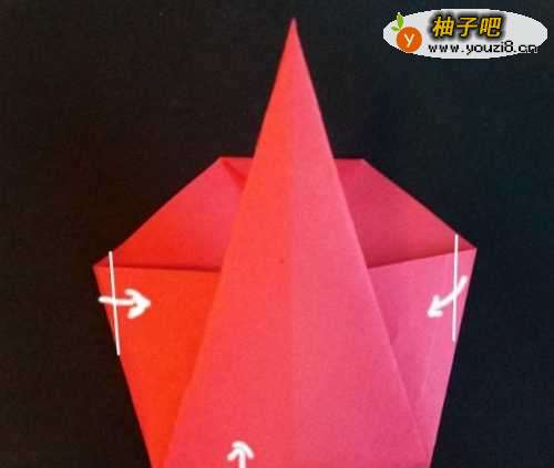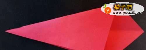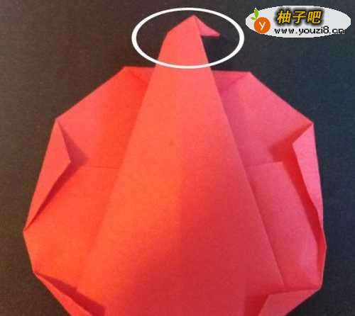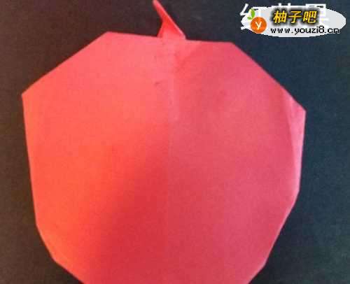 7接下来,再把上图2中尖角部分反向折叠起来,折叠后的效果参见下图1所示。苹果的果蒂就做出来了。最后一步,将折叠好的彩纸,翻到背面去,一个红彤彤的大苹果就制作成功了。