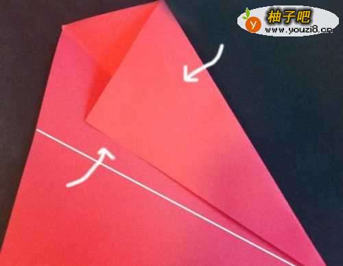4再沿着斜线位置,将另一边也向对角线方向折叠,仔细看图1,左边要压过右边一些。沿着图2的划线位置,将尖角向上折叠起来。