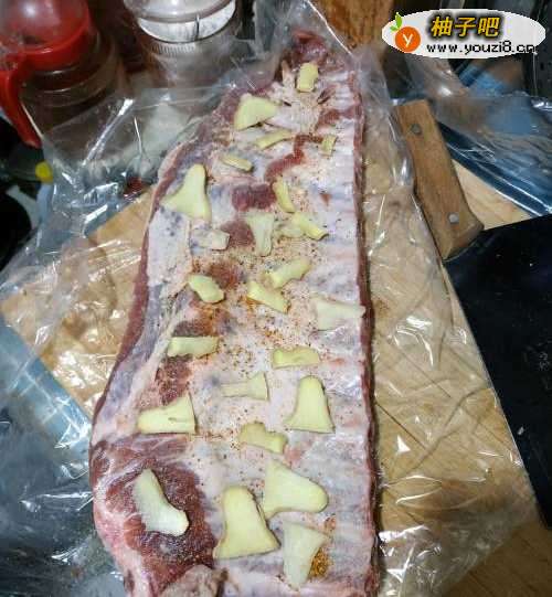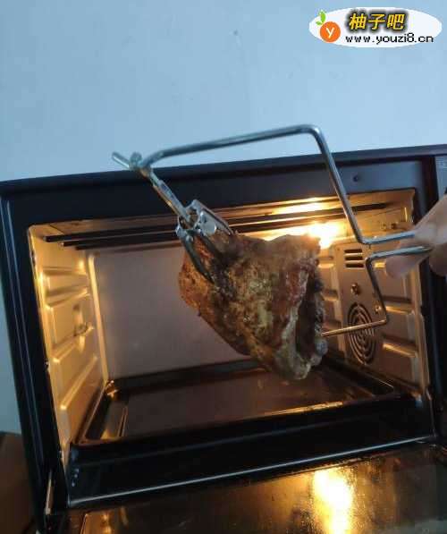 4将腌好的猪排取出,去掉表面的葱姜片,插在烤箱的烤叉上,放入烤箱中。