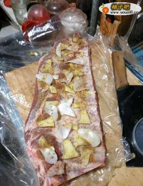 3表面铺上大葱段后,用保鲜膜将猪排包严实,放到冷藏中腌制大约一晚上,让调料渗入猪排中。